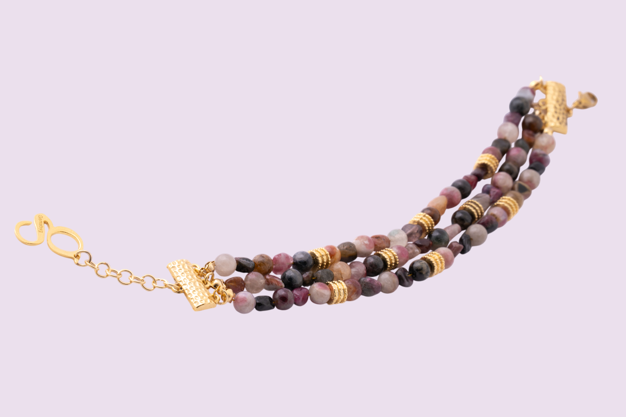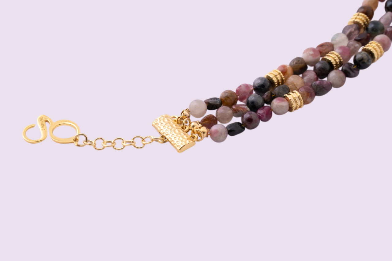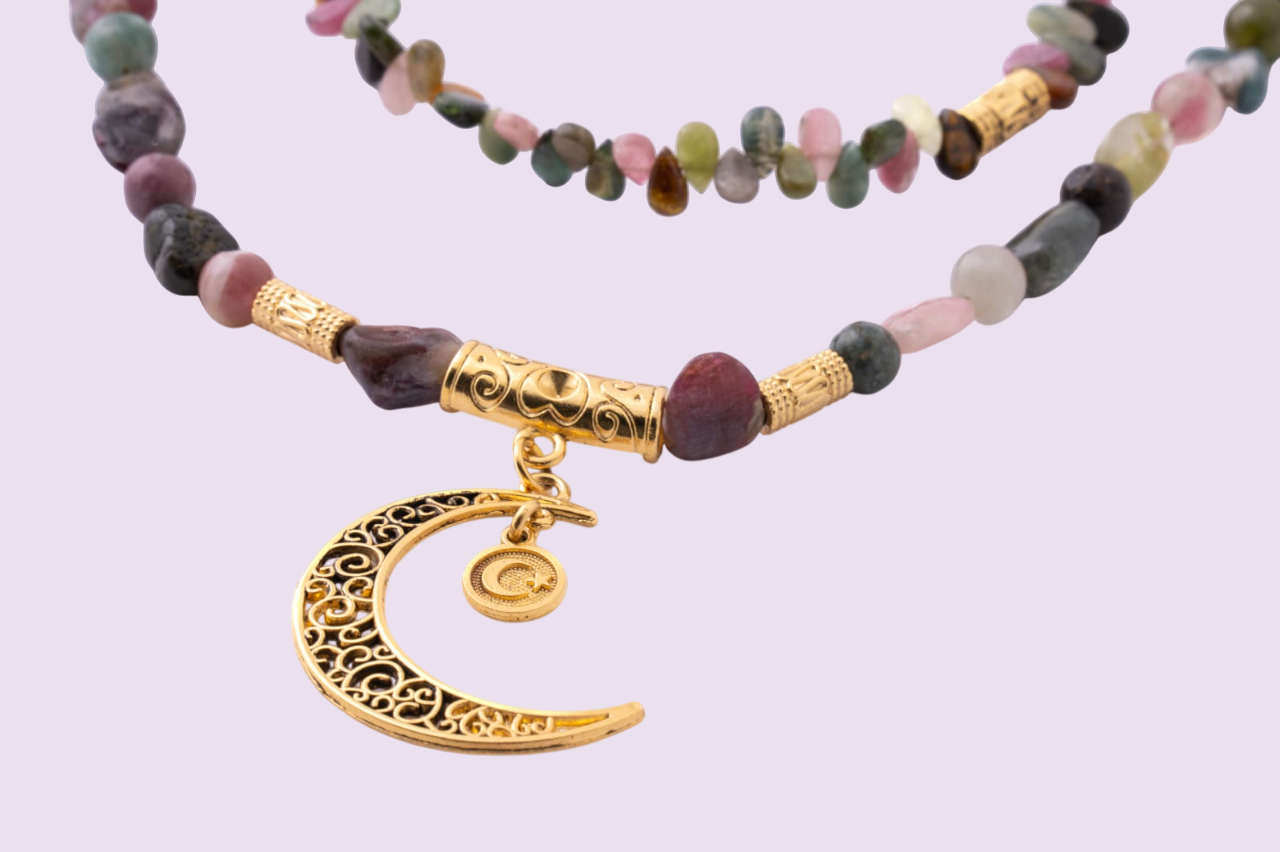 This sophisticated jewelry set showcases a unique variety of tourmaline stones in a marvelous palette of colors, featuring a distinctive crescent pendant and complementary pieces all crafted in warm 21k gold plating with a touch of copper, and finished with our exclusive brand signature.