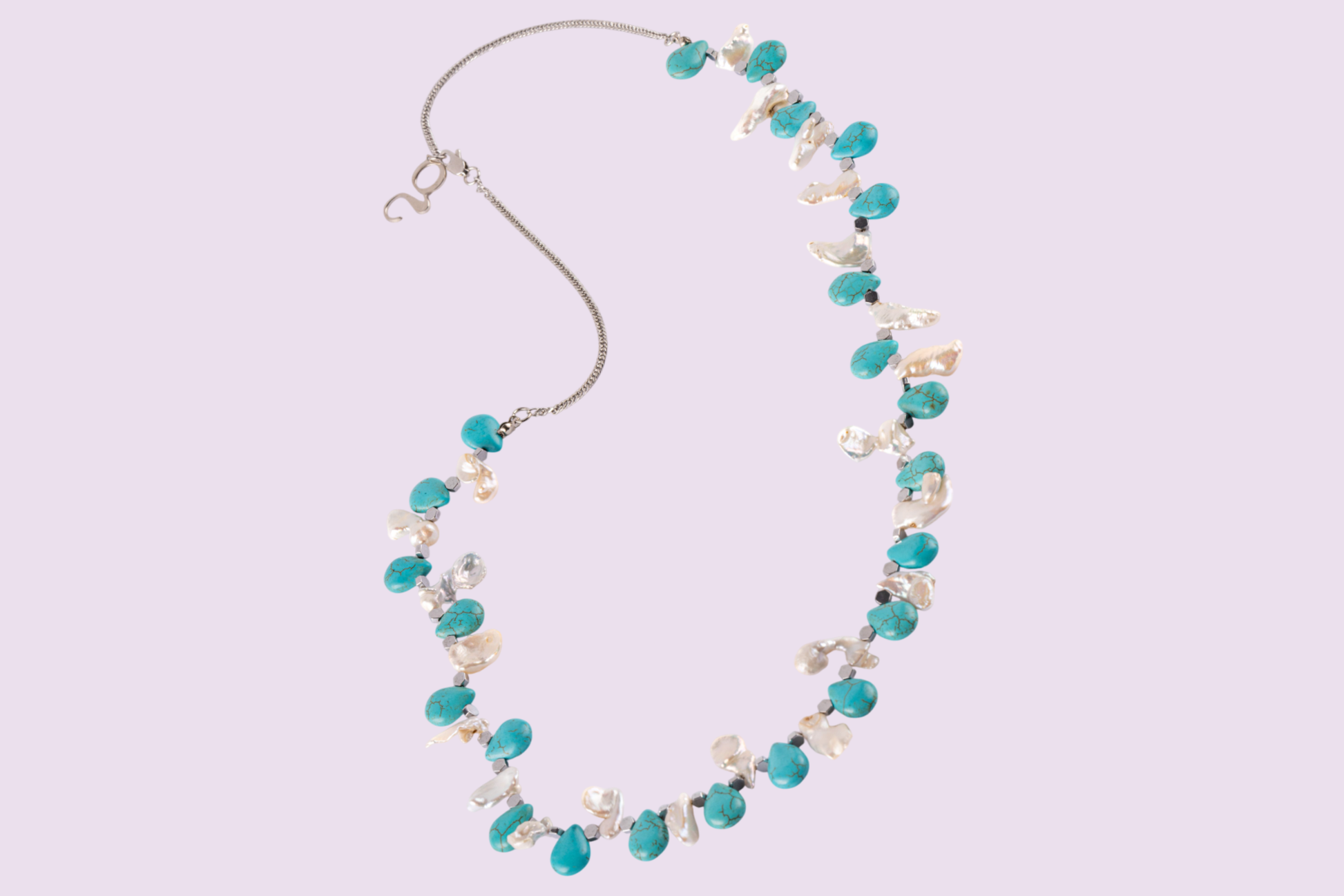 A bold statement of modern elegance, this design combines the organic beauty of amorphous freshwater pearls with the striking color of artificial turquoise stones. Adding a sleek edge, mini hexagonal silver hematite stones are woven into the composition, perfectly balanced against the refined shine of a silver Chinese gold Cartier-style chain. Completed with our brand’s signature nickel-plated finish, this piece is both timeless and contemporary—crafted to stand out with subtle sophistication.